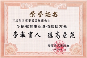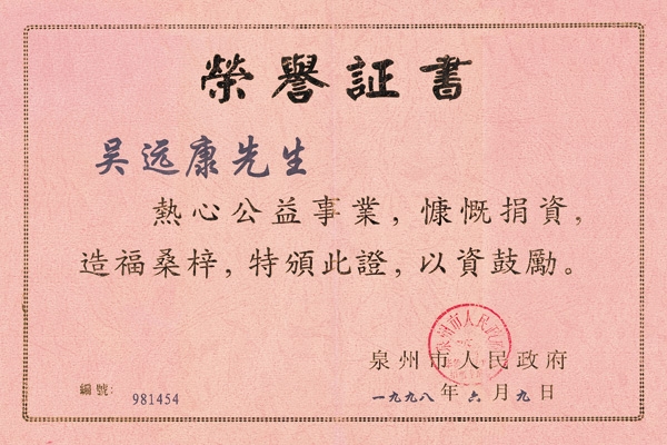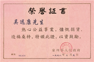 三遠集團董事長、總裁吳遠康先生獲“熱心公益,慷慨捐資,造福桑梓”榮譽證書