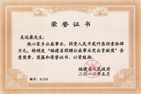 三遠集團董事長、總裁吳遠康先生榮獲福建省捐贈公益事業(yè)突出貢獻獎