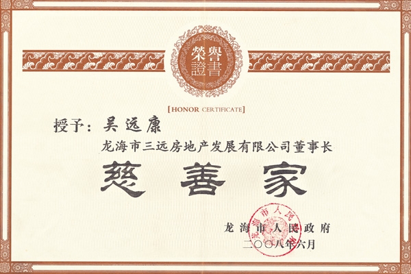 三遠集團董事長、總裁吳遠康先生被授予“龍海市慈善家”稱號
