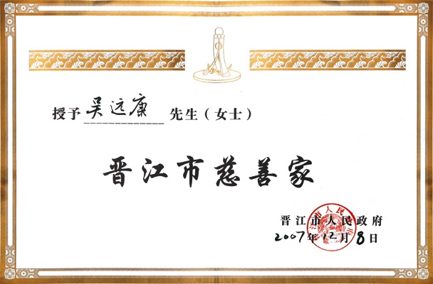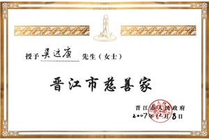 三遠集團董事長、總裁吳遠康先生被授予“晉江市慈善家”稱號