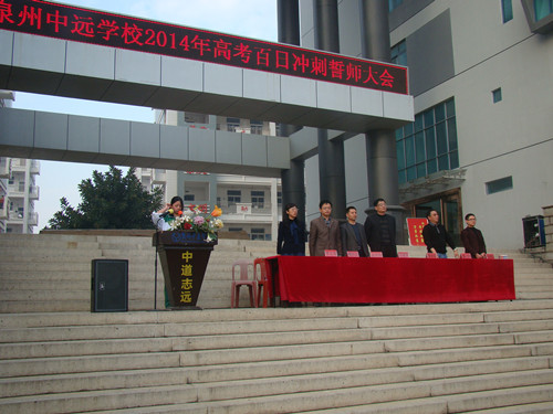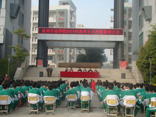 2月26日下午,泉州中遠學(xué)校2014屆高三年級舉行了高考百日誓師動員大會。校領(lǐng)導(dǎo)及高三全體師生共同見證了這一令人振奮的時刻! 王芳玉老師代表高三全體教師鄭重宣誓:“我們將精誠團結(jié),言傳身教,愛生如子;我們將刻苦鉆研,精心備課,完善教學(xué)方法;我們將隨時關(guān)注高考動態(tài),采集最新高考信息,及時調(diào)整應(yīng)考策略。” 接著,高三文科班、理科班學(xué)生代表分別上臺表達了信心和決心。他們的誓詞似春雷,似戰(zhàn)鼓,精神奮發(fā),豪情萬丈。他們表示,“學(xué)校領(lǐng)導(dǎo)的關(guān)懷是對我們前程與未來的美好祝愿,老師們的耐心是鼓勵我們前進的不竭動力,我們是中遠學(xué)子,我們要以刻苦拼搏的精神,以更優(yōu)異的高考成績譜寫母校的榮光。” 王延興校長勉勵學(xué)生志存高遠,銳意進取,堅定信心,準確定位,鎖定目標,科學(xué)安排,提高效率;以敏銳的觀察能力,勇敢的探索精神,嚴謹?shù)乃季S方式,健康的心理素質(zhì),永不言敗的壯志豪情來奮戰(zhàn)100天,智取高考這座高山。
