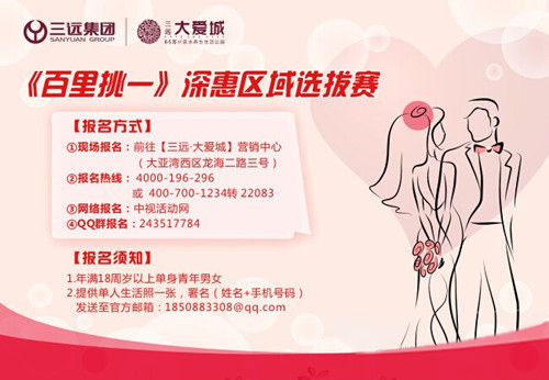 據(jù)悉,6月7日不僅是“三遠(yuǎn)大愛城東方衛(wèi)視《百里挑一》深惠區(qū)域選拔賽”正式開幕的大喜日子,也是三遠(yuǎn)大愛城啟動千人團購優(yōu)惠活動的吉日,參與千人團購優(yōu)惠活動,最低首付5萬元起! 另外,在選拔賽活動期間,三遠(yuǎn)大愛城將推出99套優(yōu)惠婚房,成功配對的有緣人還可以獲得價值29999元的購房優(yōu)惠券!情定大愛城,讓你有愛又有家!