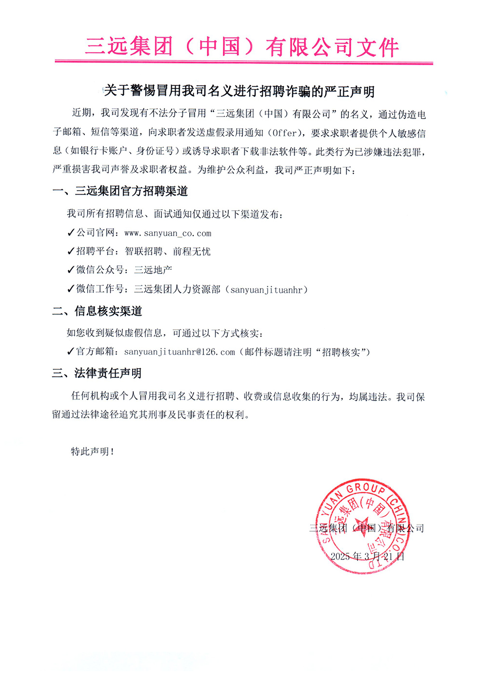 關(guān)于警惕冒用我司名義進(jìn)行招聘詐騙的嚴(yán)正聲明
